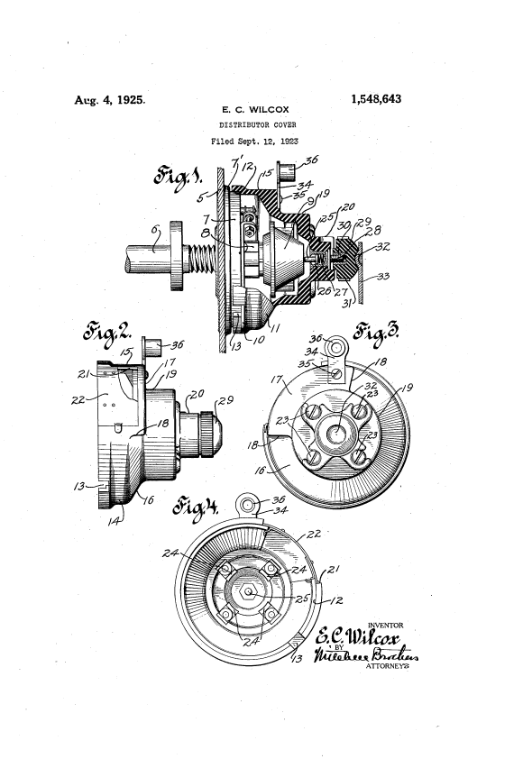 After looking and thinking about this timer/distributor cap for a few days and reviewing PeterN's patent app papers and the drawing, I have come to the following conculsion. It is definitely a high tension distributor cap and not a low tension timer. The patent application paper refers to the open window that has access to the points. Also mentions that a cover is placed on the window to protect it from the elements and dirt. The notch in the lower rim of the cap could very well be an indexing notch for the point plate. I think I know of an individual that might have the point plate in his collection. I will see him at Hershey.