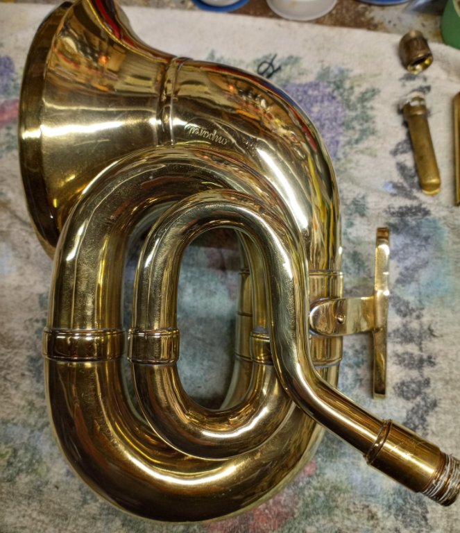 Apply clear gorilla glue sparingly between tube and horn. For ‘crannies shining’, seek out a high school brass instrument repair and restoration shop. I had good luck with a Czech down around Beeville.