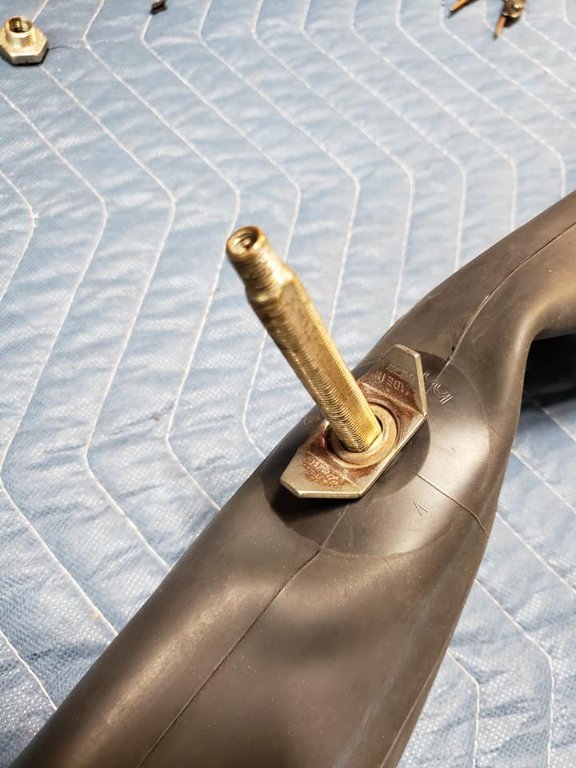 - The new valve stems we removed. They are vulcanized to the tube. If you notice, there is hardly a flange at the bottom to reinforce the attachment to the tube. On the other hand, the flange on the brass stems is about the size of a quarter and ribbed for sealing to the new rubber tube when the tube is crimped between the flange and the ribbed bridge washer.
