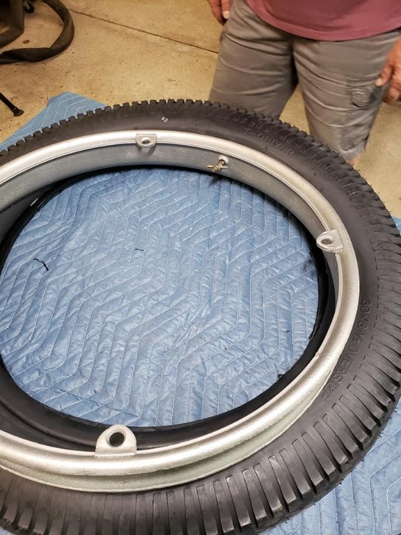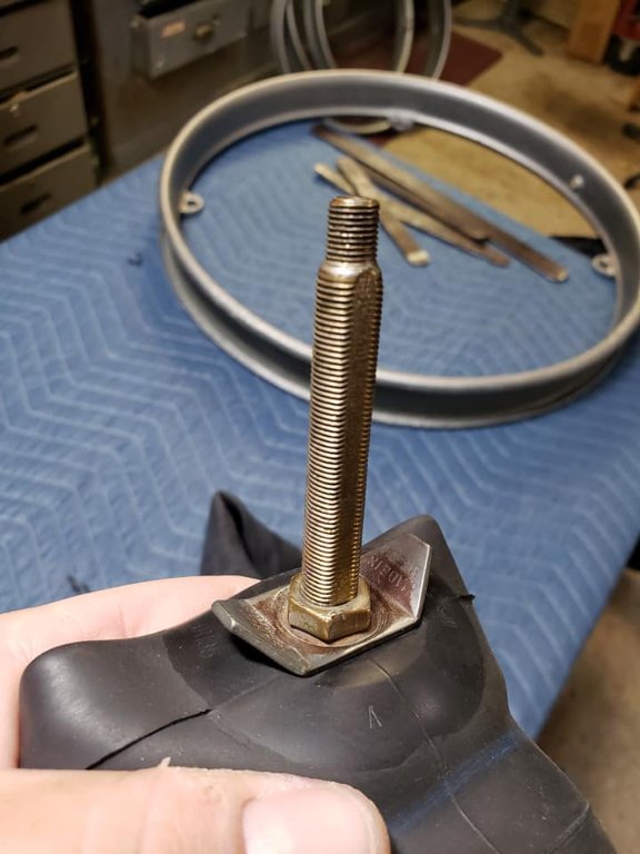 Dad and I hit a HUGE milestone in the Model T project today! The new tires and tubes I bought back in March are now mounted on my newly painted rims and are back on the car! Dad and I are very pleased! Due to the shortage of new brass stem tubes, we used a method popularized by folks such as Steve Jelf and cut the stems off brand new Hartford rubber tubes to install old metal Schrader valve stems. It turned out to be pretty simple once we got thru the first one! Can't wait to see how they stay up. We like the benefit of a brass stem that gets fastened to the rim, keeping the tube from rotating within the tire and ruining the valve stem. I totally understand others have different viewpoints. I am mostly posting this as a thank you to Steve and others who have championed the effort and provided clear instruction through their website and posts on the forum. Also as a testimonial to amateurs like us who have never done this retrofit procedures before. See the photos for a partial description of the process. I'm sure there may be one or two things we did wrong or different than seasoned T'ers.. but hey, that's how you learn. See the link to Dauntless Geezer below for a better step by step instruction. Might have this puppy on the road soon!