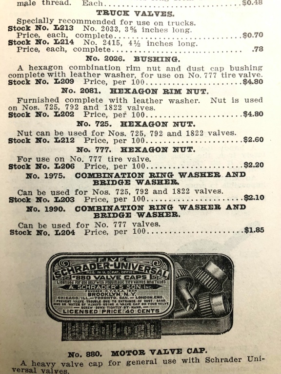 Period catalog from an auto parts supplier. Lists the Schrader 777 for the little tires. 3" and smaller.