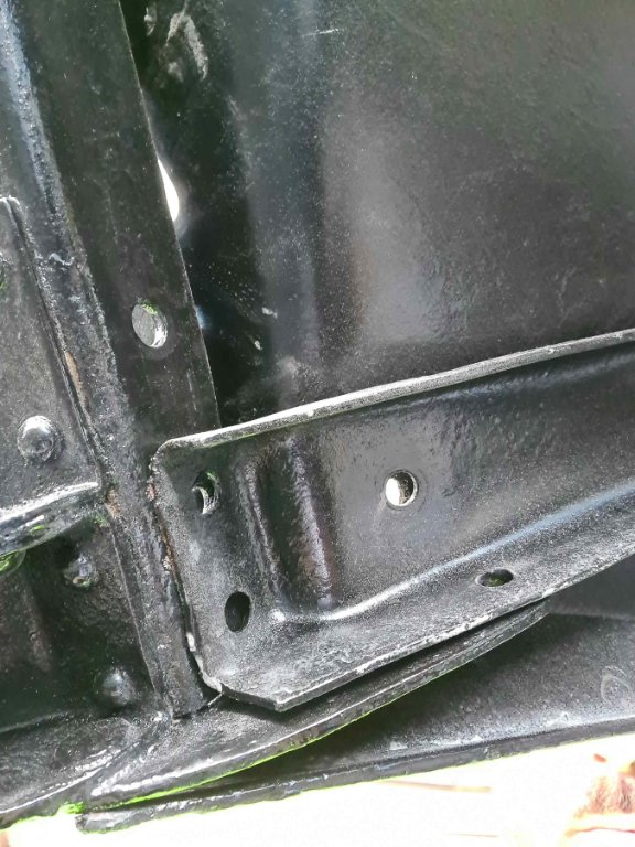 There are two holes at the lower end of the fender brace. Was the one closest to the front of the car actually used on the '26-27 cars? // Also: It looks to me like the extension bracket on the front of the frame that the fender brace bolts to is bent backward slightly, which is causing the rearmost lower bolt hole in the fender brace not to line up with the hole in the frame rail.