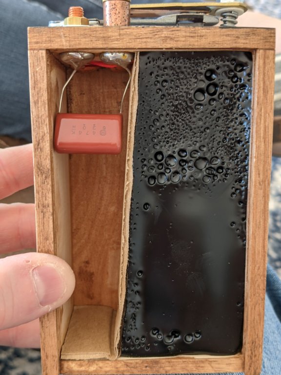 One thing that I was thinking about the other day; heat rating. While all is well and good at normal operating temperature, what about when the hot tar gets poured in? Using the capacitors from the suppliers, I have had cases where they showed a reading before potting, but while still warm did not. After they cooled completely they were ok. Left me wondering if I was "cooking" the capacitors from too much heat and if so, when would they give out? Next time I melt the tar, I might do a temperature reading.