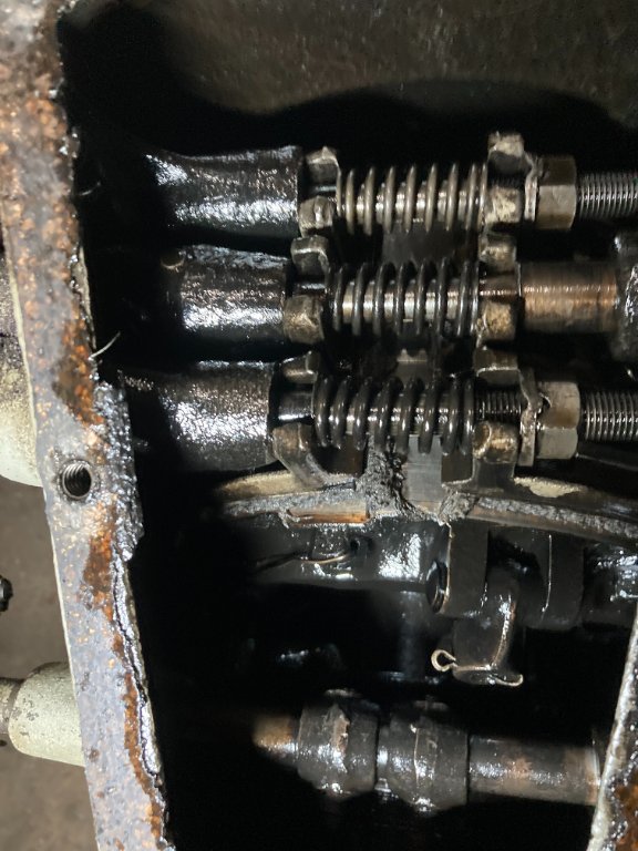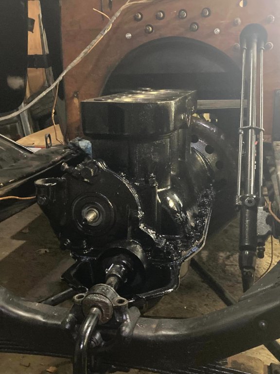 I did get Teddy back on the road. Joe did fantastic work! I did take some pics of the progress as well. Some pics didn't turn out as well and are not included. The transmission was in decent shape and not work (Teddy was LOW mileage), and after cleaning up went back in. I did take the precaution and replaced the transmission spring and adjusted the fingers per spec. Also got the engine put in with minimal effort. I went through the steps and believe it or not, Teddy fired off on the first pull. In fact I wasn't ready as I didn't think it would catch. I primed it with eight full revolutions, set it to BAT and away Teddy went. I let it run a good ten minutes, let it cool down, and then tried again. Same result (with less priming).