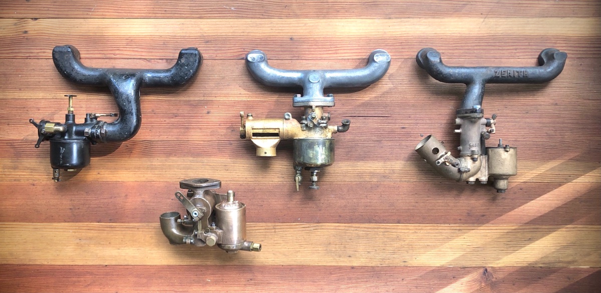 People who know me are familiar with my affliction of trying different carburetors on my 23 runabout. I like to figure out how each one works and get them up and going for a good workout. Here are the carburetors I found at Hershey this year … all except the “straight through” example on the left which is mounted on a Metz intake manifold I brought home last week. I’m anxious to try out the Master Carburetor on the bottom but don’t have any updraft manifold that will fit. Would like to hear from anyone who might have something they can spare that would work.
