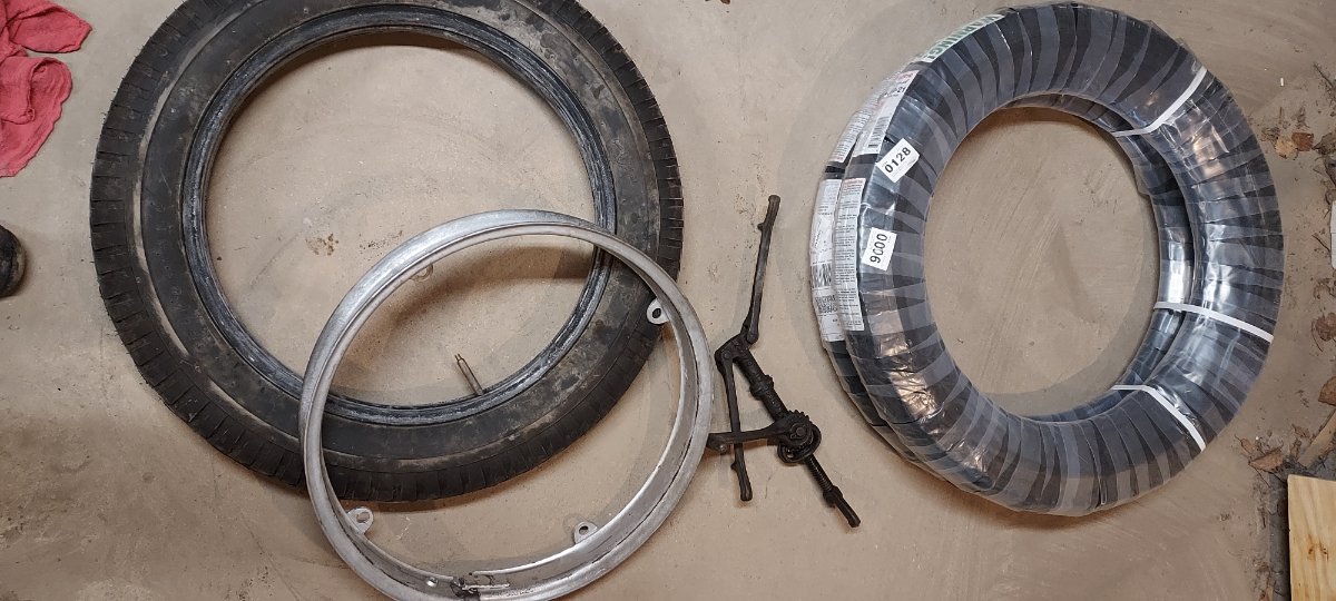 Installed smoothie gray tires on the all metal clincher rear wheels for the 1912 truck project. Got the tires from Coker at Hershey, and fitted them up.