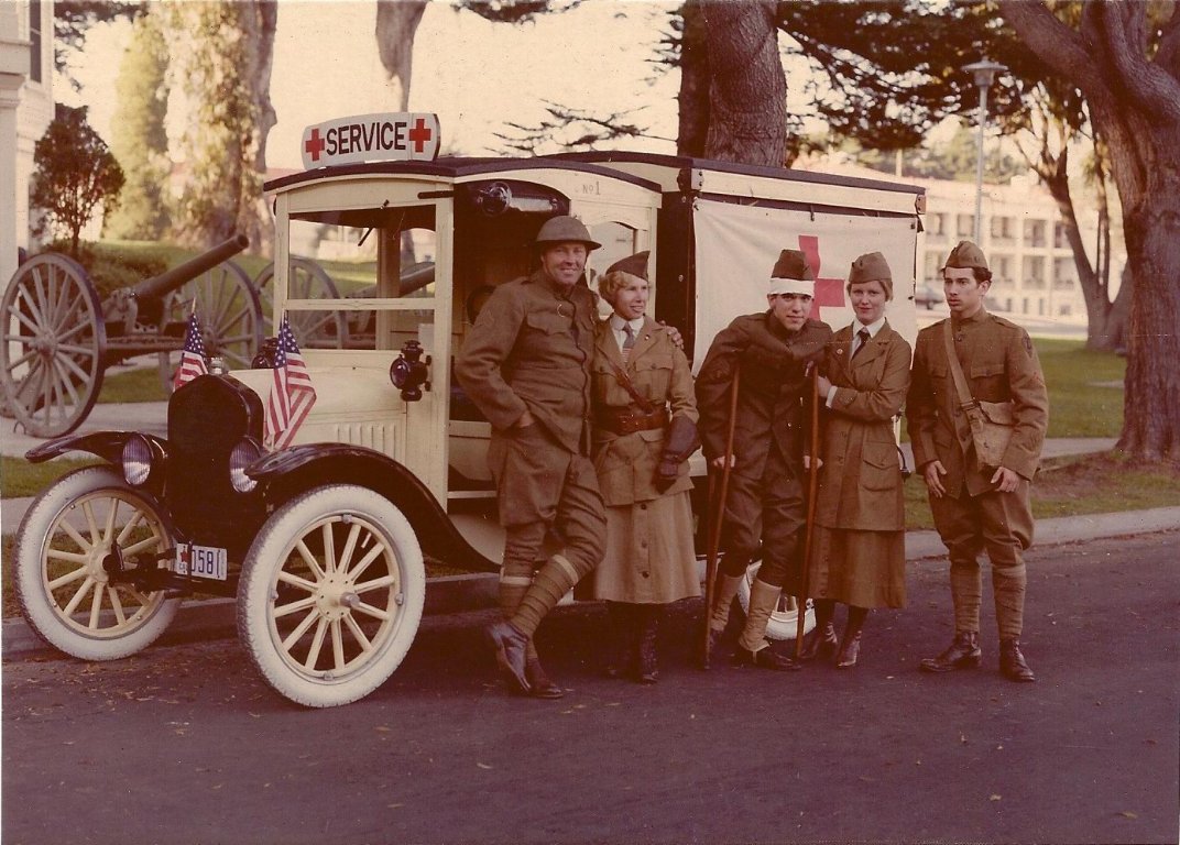 A couple of your pictures reminded me of our WW1 Red Cross unit taken several years ago at the Presidio in San Francisco on Veterans Day. The truck is our 1920 Ford. The "crew" is L to R, Larry Streeter Sr. U.S. Army Karen Archer Women's Motor Corp, Tom Bertino wounded U.S. Army, Karen Erceg Women's Motor Corp, Bob Hillman U.S. Army. None of these folks are actual real military veterans.