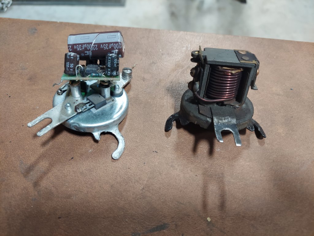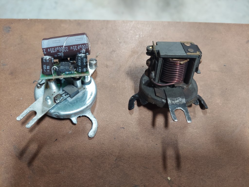 The one on the left can be normally repaired by cleaning the points,and adjust so that the points close at about 6.5 to 7 volts. I clean and check mine once a year.