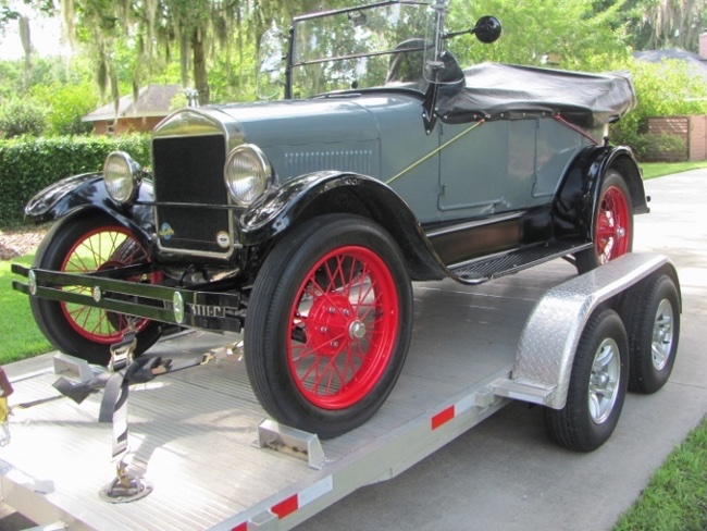 Thanks everyone. Some very good suggestions. I am now trailering my new to me T home. Did the criss cross straps method with the front wheels against the Jelf stop. Speeds below 45 mph. Floor boards and seat cushion removed, and top down and tied up.