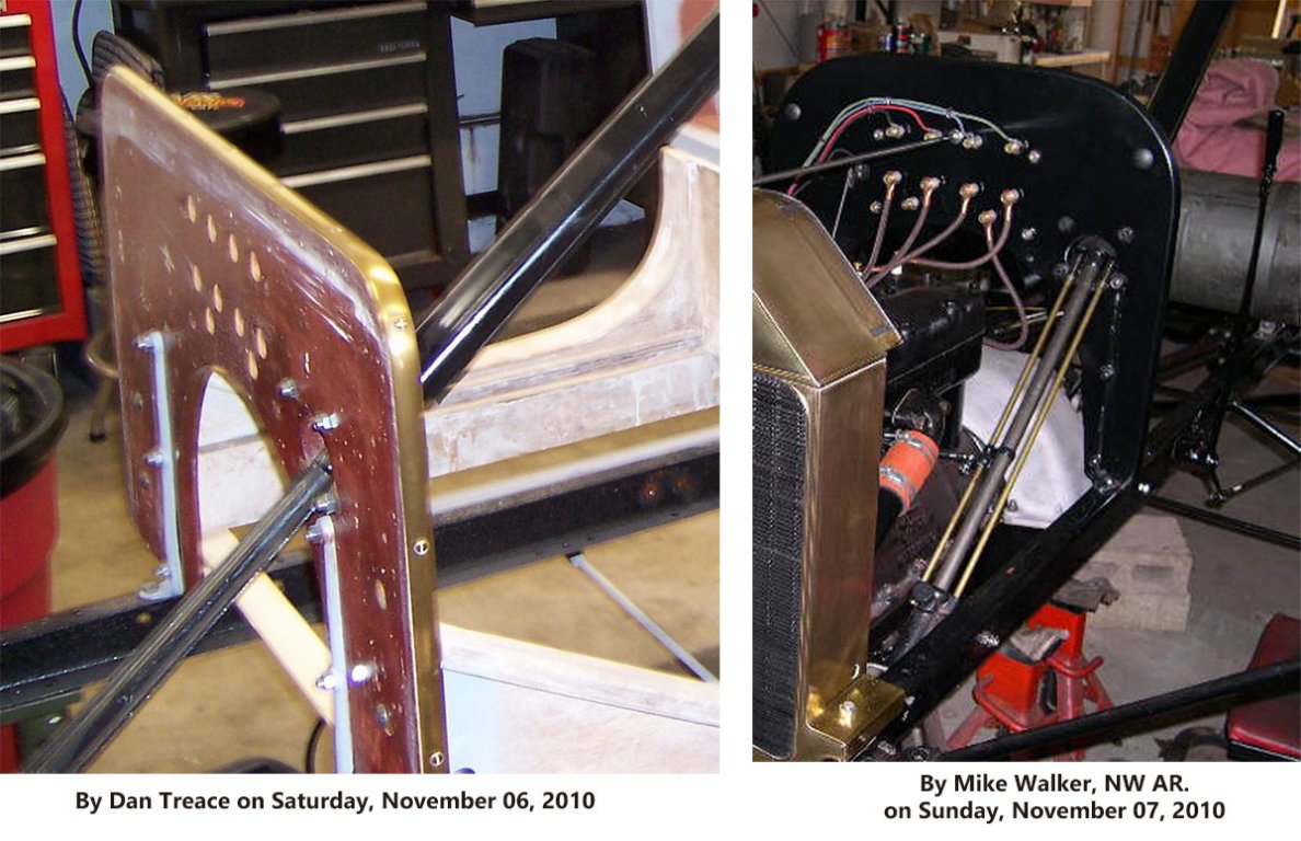 Steve, the countersunk brackets are from the 1909 to early 1911 models. If they are cast brass, they are most likely a reproduction. If the they are not, congratulations, you have a nice early original pair. This style had a countersunk slotted screws that went through them from the engine compartment side, with normal hex nuts on the drivers compartment side. Installation on your 15, was the opposite, with the coach screw/bolt going through from the drivers side and the square nots going onto a flat surface on the bracket. I will try to find some pictures which show this method.