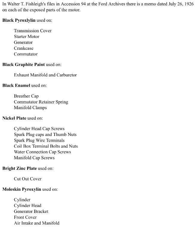 ModelTWoods wrote: ↑Sat Nov 06, 2021 10:36 pmDoes the MTFCA Encyclopedia give this information? Painting the stamped steel parts a different color than the cast parts' color, would certainly set them off, but I can't believe Henry Ford would put that expense into a Model T engine. It took him 18 years, just to change the head bolts and some other engine hardware from painted to nickle plated.