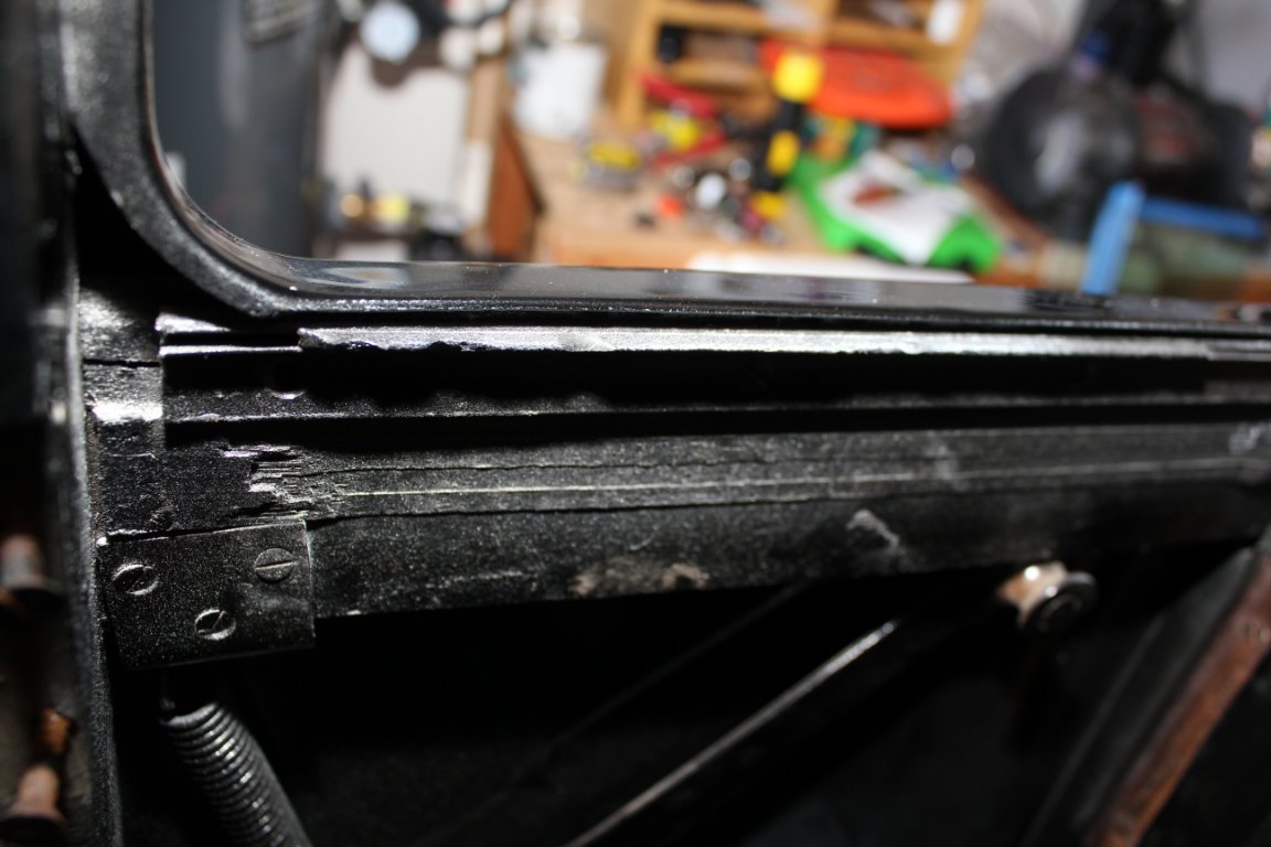 Perhaps the spring-loaded arm (roller should be under the bottom window frame) which assists in raising the window has slipped to the outside of the window, thus jamming it. Another possibility is that the roller on the arm has broken or chipped, but that shouldn't stop the window from working, just making it more difficult. Can't find all my photos of that area on my '25 coupe, but perhaps these, along with others posted, would help visualized what is happening. Upholstery side panel likely will have to be loosened.