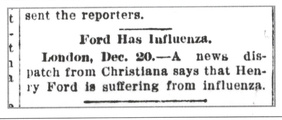 In 1915 it was announced that Henry Ford had developed influenza. Don't know if this was covered in the United States at the time?