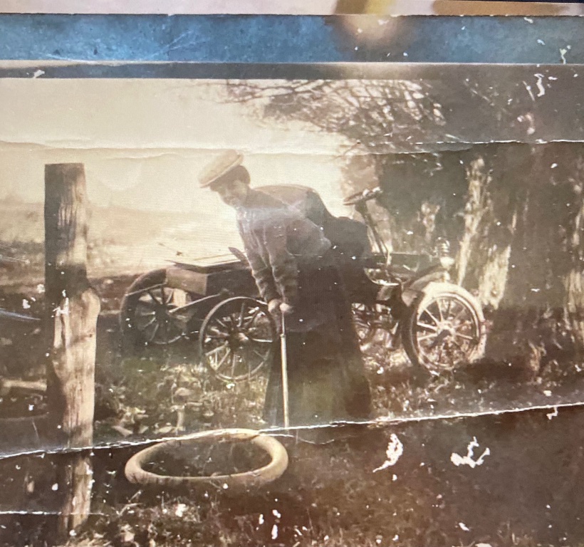 Here’s a picture that was posted on a local forum of a family’s Great Grandmother trying to fix a tire. It was taken between 1910-15. Is it a very early Ford before the Model T or Olds or??