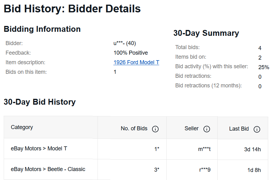 I thought I check to see what I could fine out about the bidder. eBay does provide some info but gives the bidder an anonymous id for that particular auction & shows what else they are doing or have done. So based on the info below this bidder is relatively new, hardly any activity. Has only bid on two items so far 3 bids on a VW item and 1 on your T. So be a bit cautious and stick with your payment specification CASH! If you don't know the person do not allow a bank transfer of funds. Also arrange the purchase at your bank, you can deposit the cash and they can notarize whatever. Best of luck