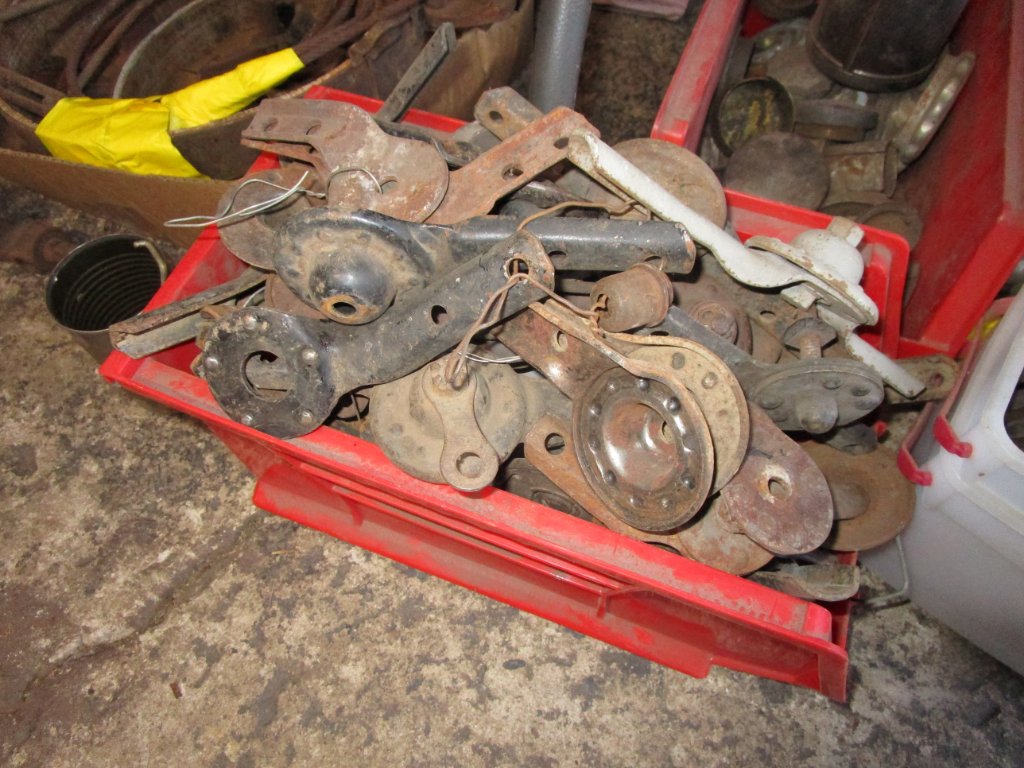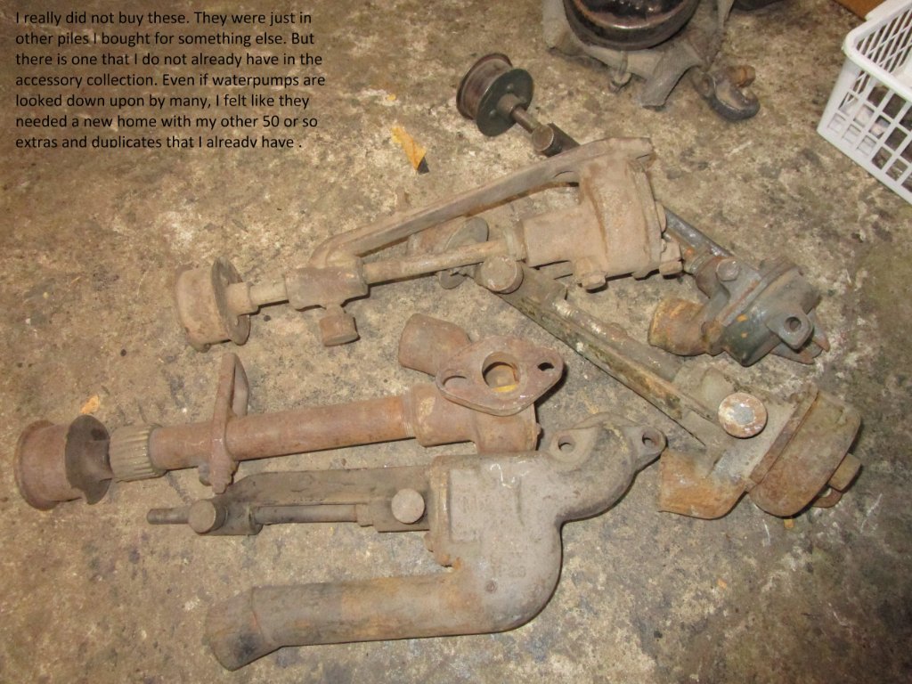 The following photos are of some of the things I bought or of some of the extra things that were in the piles I bought. The first pic is of a power unit. I think it is a "Farm Power" but will have to research it a little more. It jacks up the rear end and then two small pulley like wheels on a shaft run against the rear tires and turn the shaft for power to a pulley also on the shaft. I already had the shaft, bearings and pulley but will have to make the two small pulley/wheels that run against the tires. I have added some comments on some of the photos. Kinda hard to see some of the comments unless looking for them ... I still have not gone thru all the bags in the boxes yet. Its like a early Christmas ... Overall we had a very good time, met and visited some good people, and had a nice 4 day vacation trip with old car parts. and if Im lucky Ill be able to sell enough of the extras and duplicates to help pay for the gas.