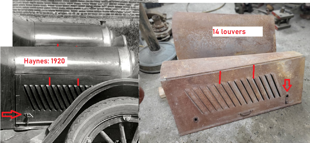 I think the Oldsmobile photos look pretty close too, and Frank's close-ups help. His photo of a Model 45 has 15 louvers, which will not not match my 14 louvers no matter HOW hard I try. How many other Oldsmobile years and models were there that might have had 14?