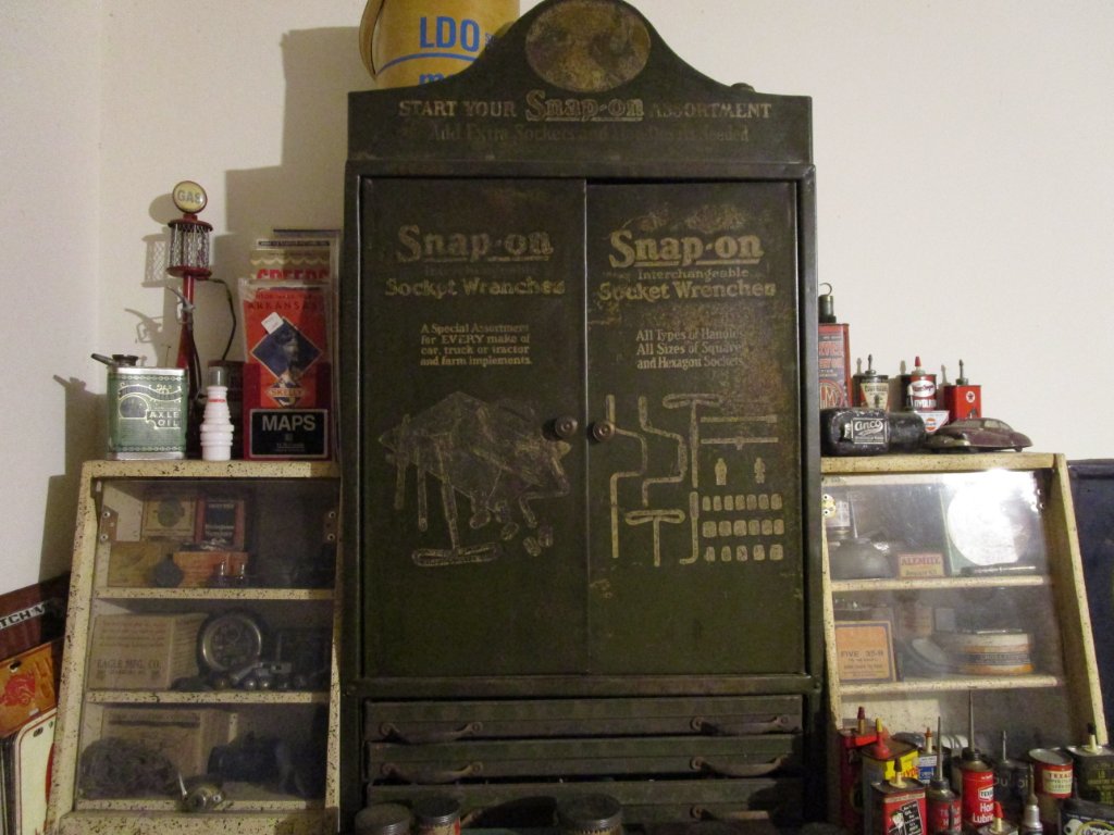 Here is a Snap-On tool cabinet that my uncle gave me several years ago. It came out of an old garage in Yale Oklahoma. It is of the T era, and probably was delivered in a model T. Snap-On told me it was one of the earliest of their dealer cabinets from aprox 1921 to 1922 era. They also said that the photo on the door was their entire product line at that time. I think I may have the only one left. I have never seen another one anywhere and the tool collector forums have never seen it either. When I contacted Snap-On, they said they do not have one. They offered me choice of any tool box they have for it. That was at least 10 years ago. Glad I kept it.