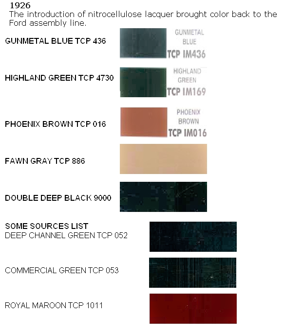 McCalley's "Model T Ford" book (page 403) states "By the fall of 1926 (1927 models?), all closed cars were apparently painted in a choice of three colors: Royal Maroon, Highland Green, and Fawn Gray." The article goes on to say later production used the new Pyroxylin paint. It lists those colors as Black, Highland Green, Royal Maroon, Fawn Gray, Gunmetal blue, Phoenix Brown, Commercial Green, Moleskin and Drake Green.