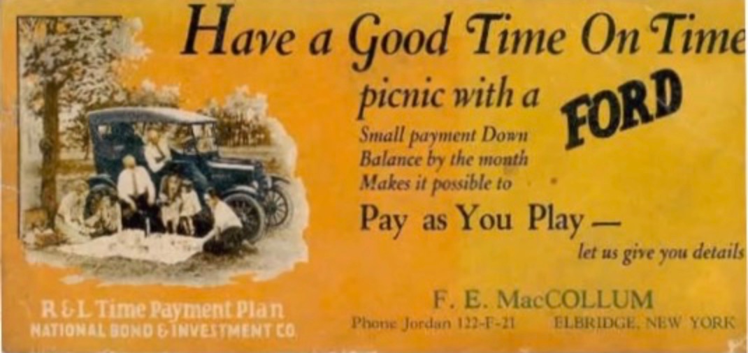 My grandfather was a Ford man during the Model T era and MacCollum in Elbridge, NY is where he purchased his cars. I have two photos of his cars. One a 1913 Touring and the other a black touring much like my ‘20