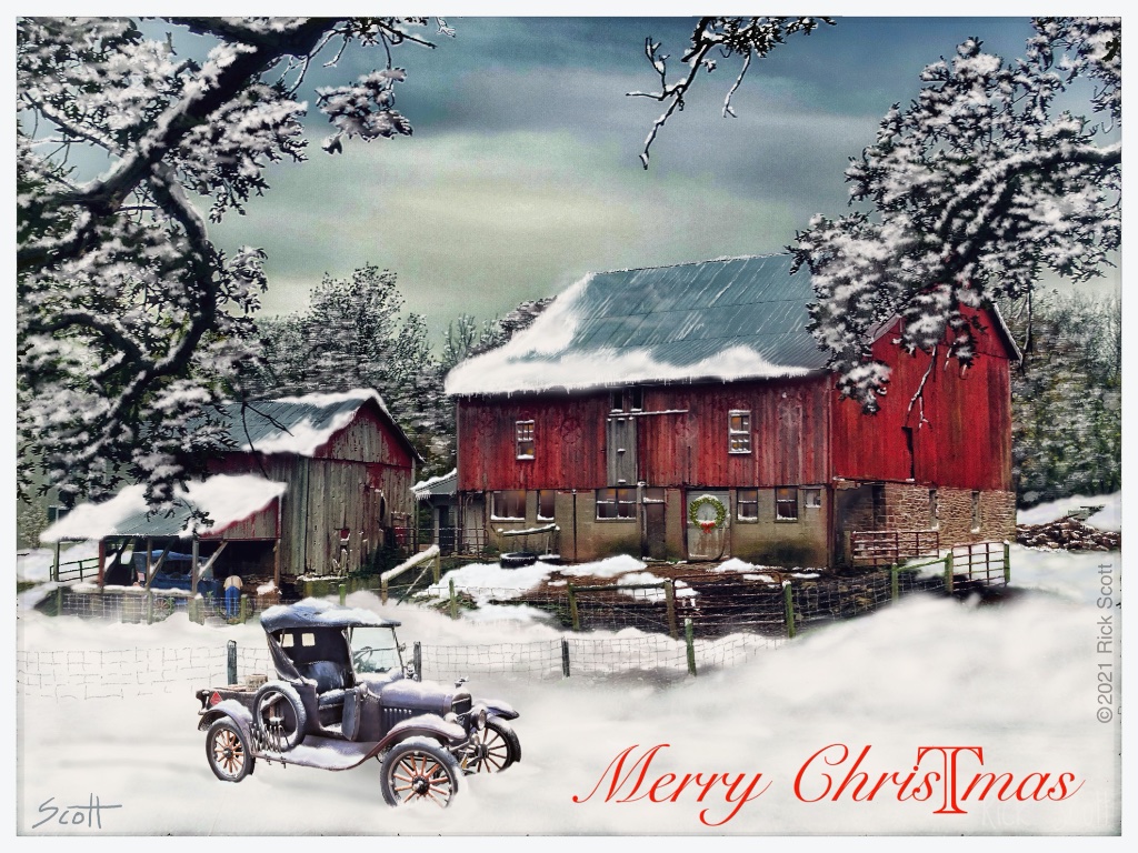 The barns are from Vermont where he took that photo, the foreground is my Nellie in Florida that Rick took when I parked in a neighbor's backyard. The T under the shed, upper left, is my Lizzie, he took that photo in my yard on a time I was in my overalls actually working on the T, didn't know he took it then either!