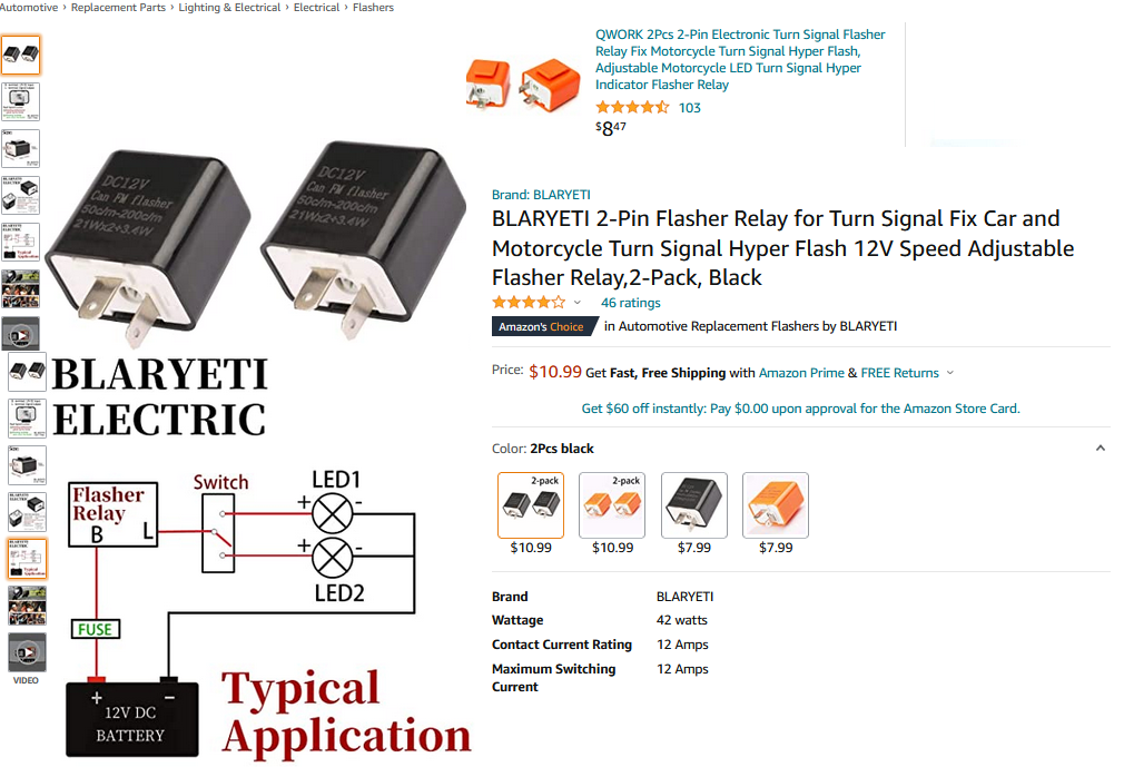 Could be that cars usually have a 3 pin flasher where one pin is to the dash blinker and this has just 2. Same flasher different color.Steve Jelf wrote: ↑Sat Dec 18, 2021 5:48 pmElectronic dummy here, seeking guidance. In scheming to add turn signals to my 1915 runabout, today I've been shopping online for components. Finding the LED towers was pretty easy. But in choosing a flasher one word is giving me pause. I've found the one below and several similar flashers at similar prices. Fine. But why are they all specified for motorcycle use? Is there something about them that makes them unsuitable for use on my car?