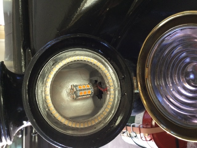 Steve, as you can see, I installed, cilinoned in 3 inch circular running lights and then removed the Vic assembly and replaced with the bulb socket. This way you cannot tell anything has been modified till the blinker is activated. In the back, same circular led for running lights but dual element bulb for blinker and brake. You run the wires out the top chimney through a heat shrink tube, heat it and it is almost unseen except from up close, but no drilling or welding is done anywhere. I also installed a second oil light on the rear passenger side so modern distracted drivers recognize what I am attempting to do. I have extra ford brackets for the second oil lamp if you need.