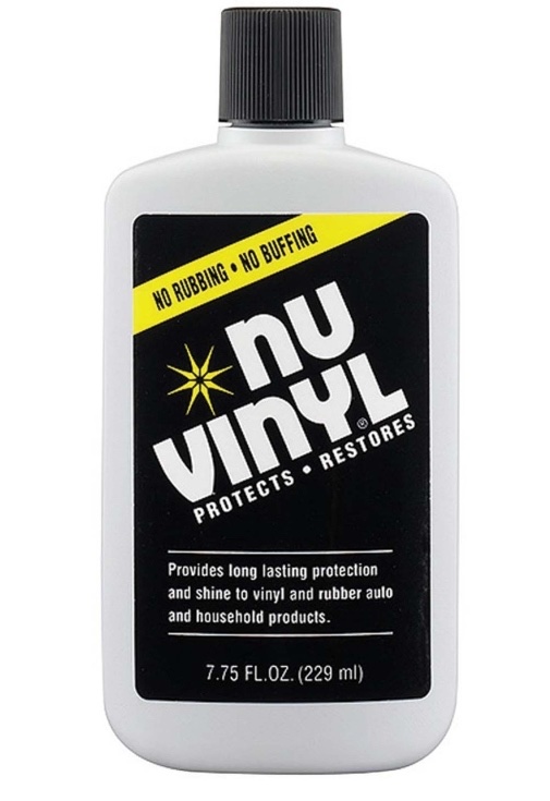 Nu Vinyl. Have used this for many years, low sheen, protects. Liquid with cloth to rub on, or you can get it in spray bottle too.