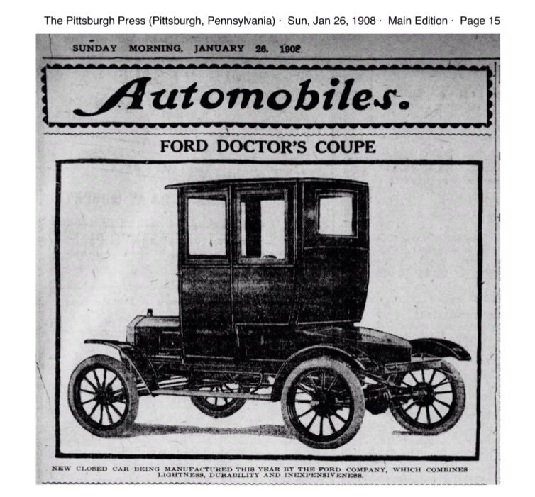 Tim, you are so right that in 1905 Ford had a model called a "Doctor's Car", and I have an original magazine ad to prove it, but the car Ford called a "Doctor's Car" wasn't a coupe at all. It was a roadster. At no time that I have found, did Ford advertise an enclosed coupe as a "Doctor's Coupe" I have a feeling that some people just called Ford coupes that, because it was the body style most chosen and bought by Doctors, particularly country doctors.