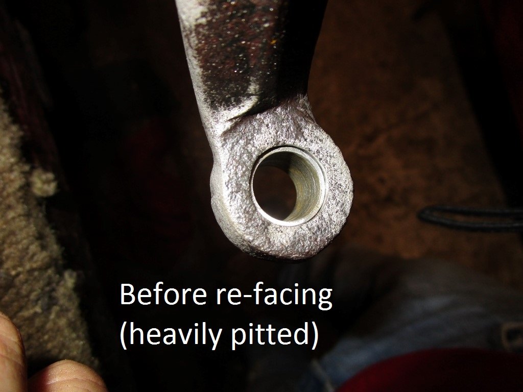 Notice the "counterbore" in the threaded insert. It is for the unthreaded portion of the spindle bolt to sit in. That way the unthread portion carries the shock load instead of the threads being beat out by the shock load of the car in use.