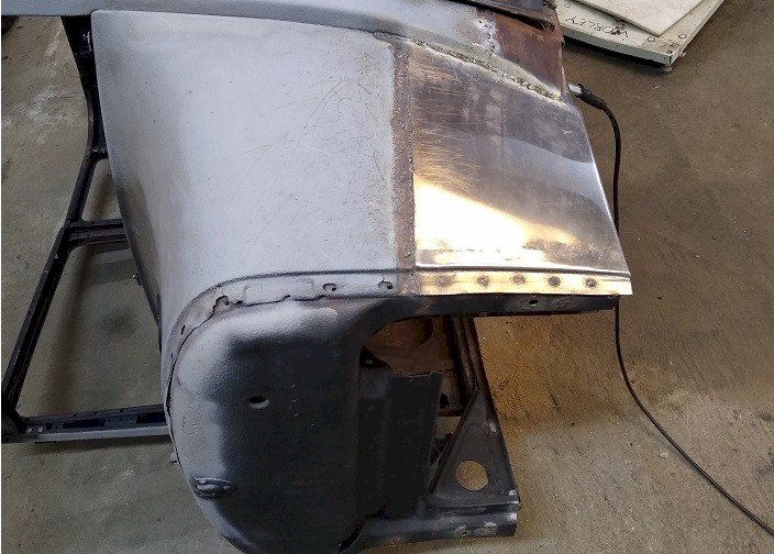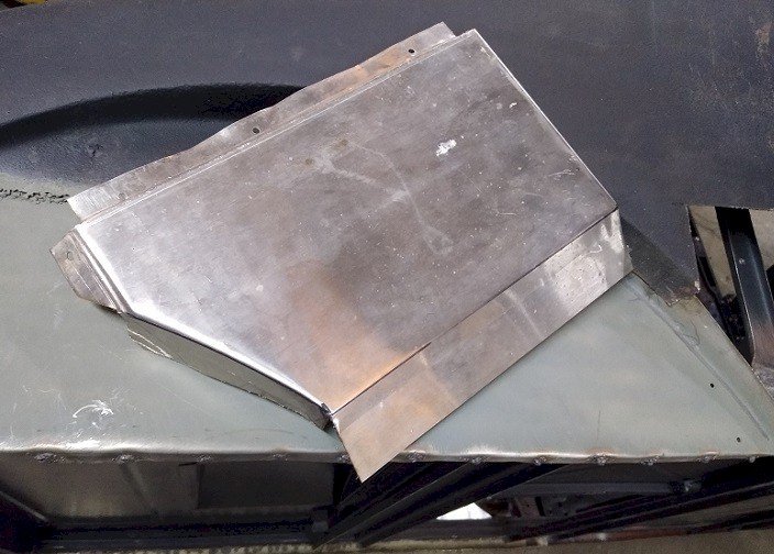 So, the rust ate up pretty high all around the bottom. This is left side bottom, between the driver's door ans the wheel well. The green etch primer is a stainless steel patch panel that I made some time ago, attached by stainless wire flux core welding. I am now just getting to the next piece, also stainless. The patch panels that I bought were too small for the damage from rot and I found some paper towel dispensers from a men's rest room that were being replaced during a remodel,