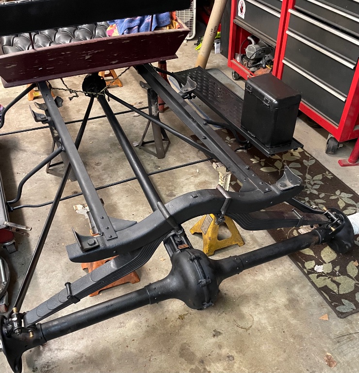 Put on the fenders. running boards and hood on the 25 Touring to check the fit. Will take them back off for more body work before painting. The body is re-wooded and ready for final prime and paint. Engine, transmission, rear end and chassis rebuilt. Hope to have her on the road this summer!
