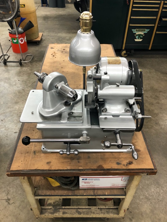 I have the same Sioux valve grinder. Mine is still wearing about 95% of its original paint. Without going out to look, think it is a Catalog number 650. It had a new stone installed when I got it. Only problem is, the outer diameter is now too small to use the stem grinder. With the chuck installed, the stem holder can only go on one way, putting the Vs to the outside of the stone. The stem ends up with a nub on the end. While I don't think so, the stem holder that came with it, may be the wrong one. The stem grinder is missing the stem clamp/hold down. It also came with the stone dresser, the allan tool with knurled handle for adjusting the collars and one other piece that don't recall its use. Because this model is dry grind, takes a little more time to grind the valve and stems, allowing a cooling cycle.