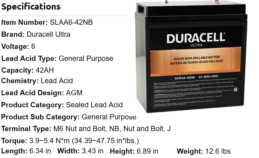 Couldn't find a CA or CCA spec for the Duracell.TXGOAT2 wrote: ↑Thu Jan 06, 2022 12:54 pmA smaller, motorcycle/riding mower type battery might have enough energy storage capacity to start a Model T several times, but I have to wonder if the current demand of the T starter would exceed what the small battery is designed to deliver. Lead/acid type batteries have a low internal resistance, and are capable of delivering a lot more current than they are designed to withstand.