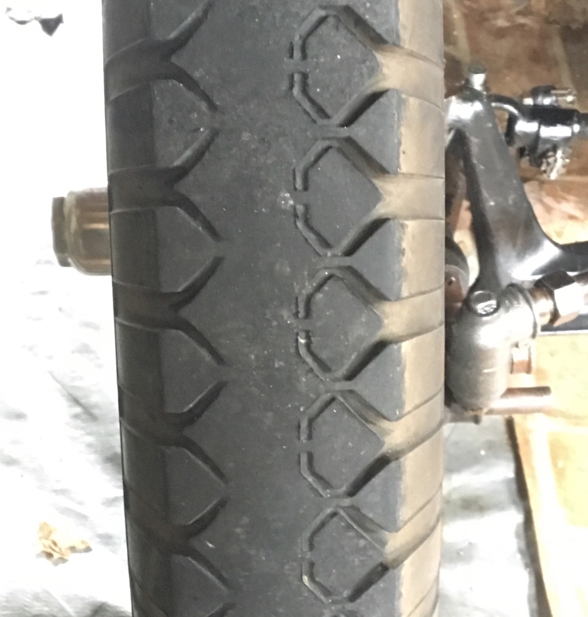 Some extra wear on the outside tread is inevitable due to the built-in positive camber. At that point, I put the worn tire on the rear and mount a new one on the front.