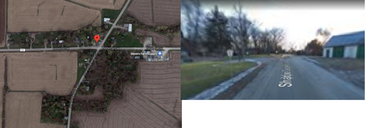 Both. Intersection of Sharon Center road & 500th street. Unincorporated ,Feed mill , body/welding shop and some houses, used to have a small general store when I was il high school.
