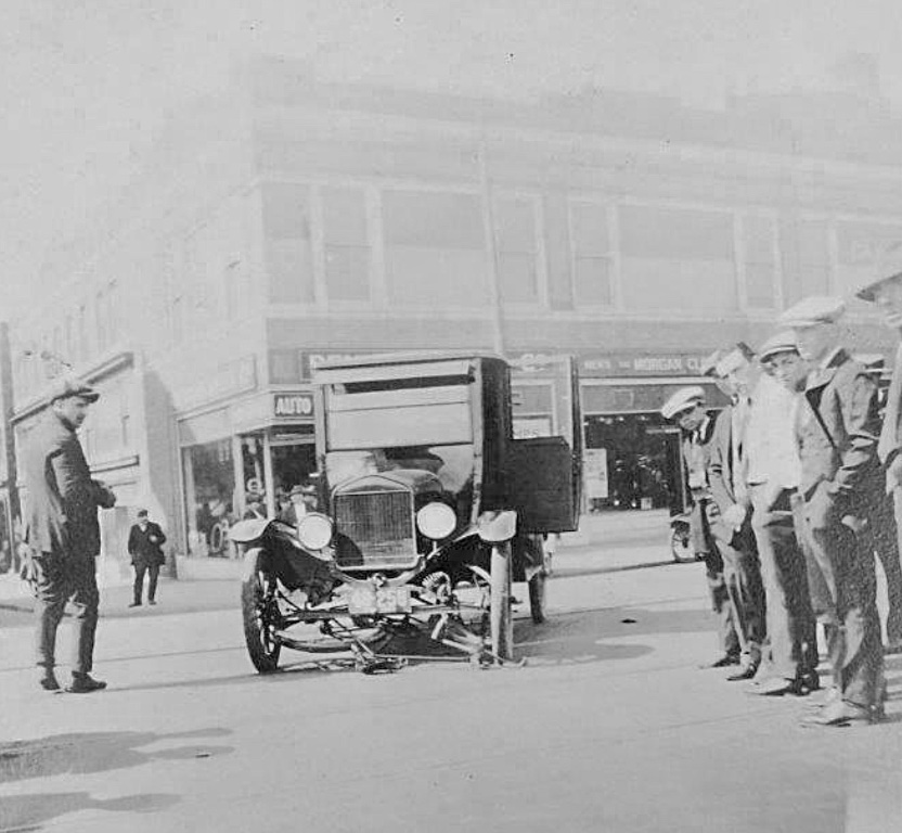 That ‘26 runabout with top up, CA 1930 plate, neat accessory headlamp/fender brace. But oh…..been in a small wreck, the drivers front fender is broken away at the frame…..but worst is the busted wind wing glass….those sharp edges of plate glass! Yikes