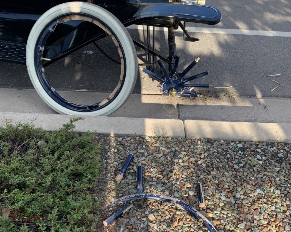 Ben, Please have your wood felloe wheels rebuilt. Here are a couple of photos of what happened to an original wheel that had a loose felloe. The restorer (not me) screwed the felloe to the rim along with the rivets. The wood was original and looked good, but was filled with wood filler to make the wheel smooth. Upon making a slow left turn, the wheel exploded. After taking all of the wood from every wheel, I observed that the previous owner had made the wheels look good, but had not made them safe. The four wheels on this car have been sent to Noah Stutzman for rewooding. I urge you to have your wheels redone by a reputable wheelwright. I highly recommend Stutzman's Wheel Shop in Baltic, OH. Your safety is worth MUCH more than the cost of four rewooded wheels!!! I hope this helps. Russ Furstnow