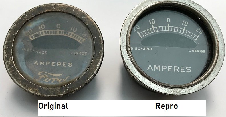 Comparisons, the lower left is a repro or Model A meter but I installed an original flat face collar to mimic the look of an original T Ammeter. The thin alum collars of the repro Model A style just don't look Ford T to me