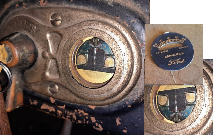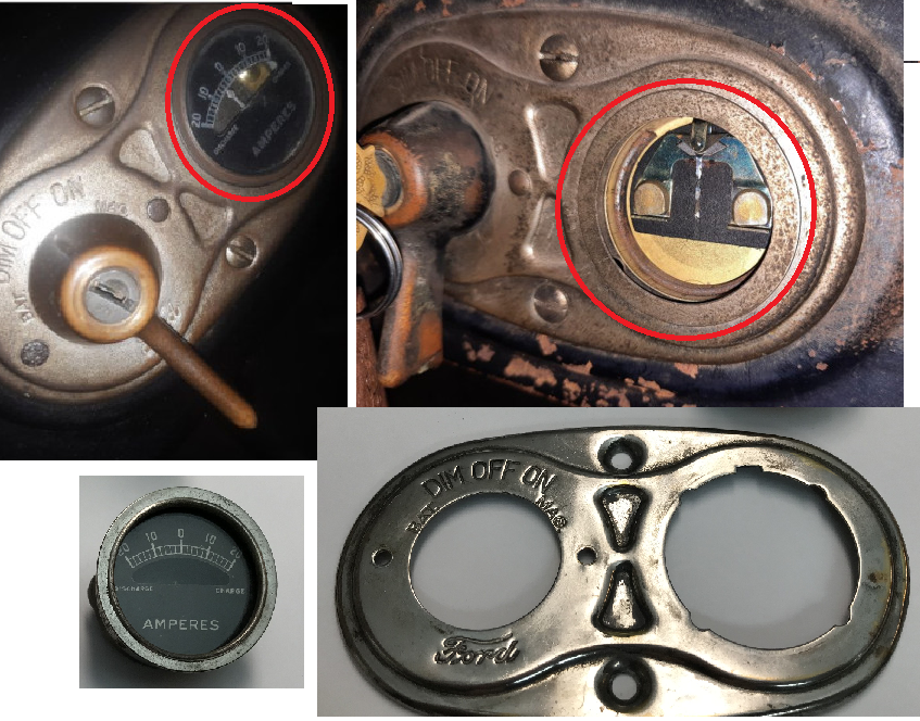 Comparisons, the lower left is a repro or Model A meter but I installed an original flat face collar to mimic the look of an original T Ammeter. The thin alum collars of the repro Model A style just don't look Ford T to me