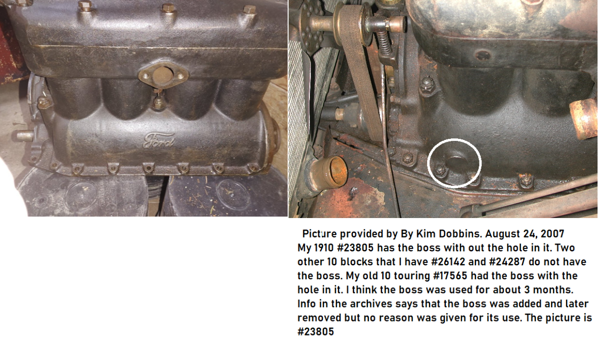 The pictures aren't clear enough, or show the right areas, to be certain of much. It does appear to be a pre 1919 block, modified to pass as a late 1910 or early 1911 open valve block. The "serial number boss" isn't shaped properly to be an original open valve block. It looks like the later no generator block has had the corner web cut away to appear to be the serial number boss. However, the real open valve blocks had a more straight and square embossment than this one has.
