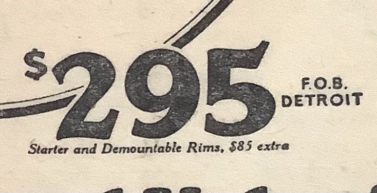 I believe the record low price F. O. B. Detroit was $265.00 for the 1926 roadster. By then, I'm pretty sure that included self starter and demountable rims. ?!?