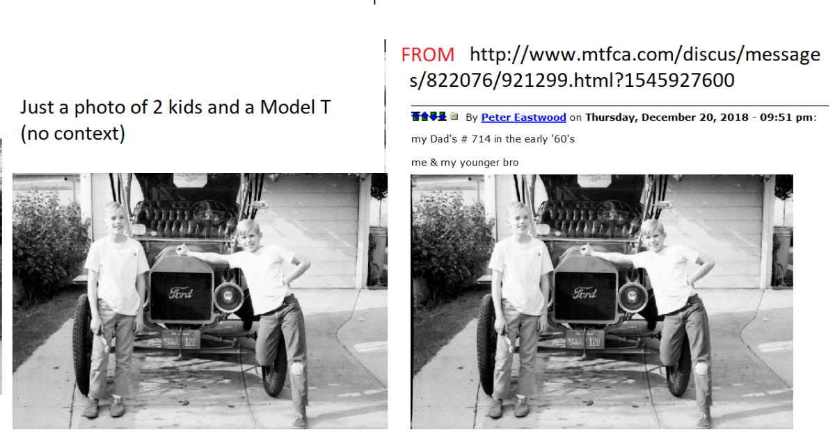Provenance needs to be supported be documents : pictures of people with a time reference in the photo. Paper documents etc. "Known" = Noah an the flood if you understand what I am getting at.pete eastwood wrote: ↑Wed Mar 16, 2022 1:47 pmAs far as provenance, model T #714 that my family once owned has a complete know history.