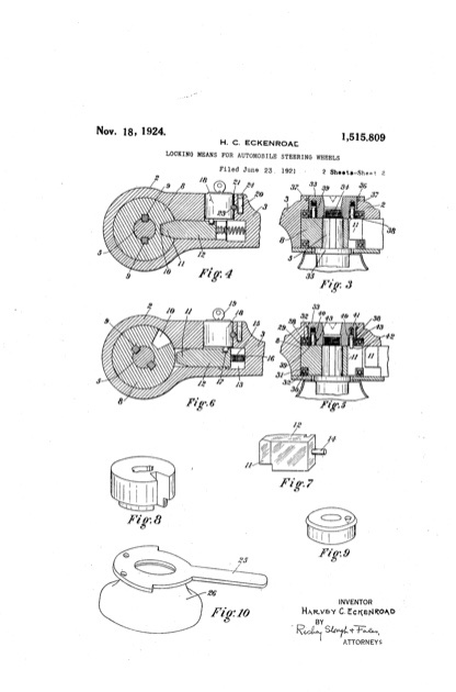 My wheel is a match to yours I haven't needed to take it off. The plate on the spoke reads Underwriters Labritories Inspected Automobile Lock Group NO 2 then a box with a number stamped in it.