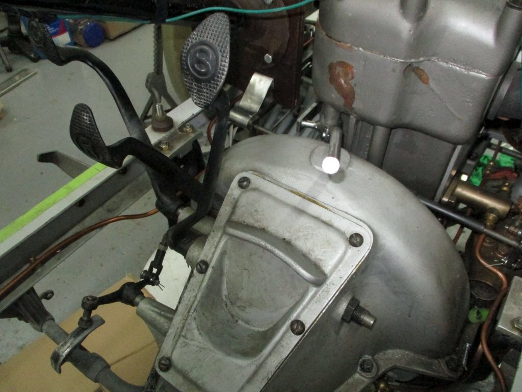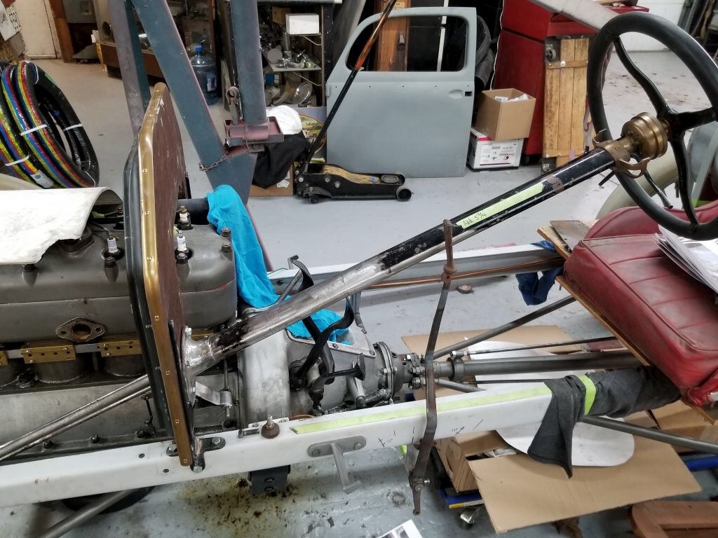 Peter and the guys are coming along with the Ford Special racer. Just received pics of the auxiliary exhaust ports sliding rail and foot control (to the right of the steering column in the first pic):
