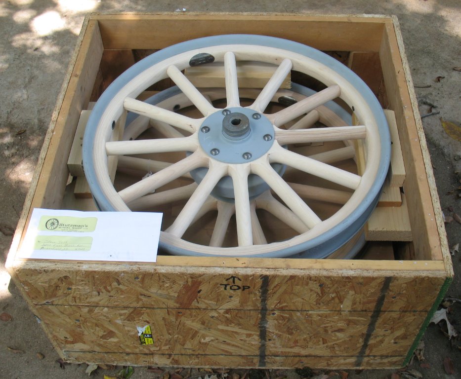 I only needed three wheels, so I made a box to hold three completed wheels and sent the metal parts to Noah Stutzman in it. I supplied all the metal parts except the tubing he installed for the valve stem holes. The box was made of particle board and 1 x 4 boards. I believe I sent it by Fedex and he returned it by UPS. No problems either way, but I think Fedex cost less. The gray primer was a big mistake. After the wheels were painted you could see the least little nick or scratch (as from mounting tires) from twenty feet away. If I have any more wheels made I'll use black primer or a primerless black paint.