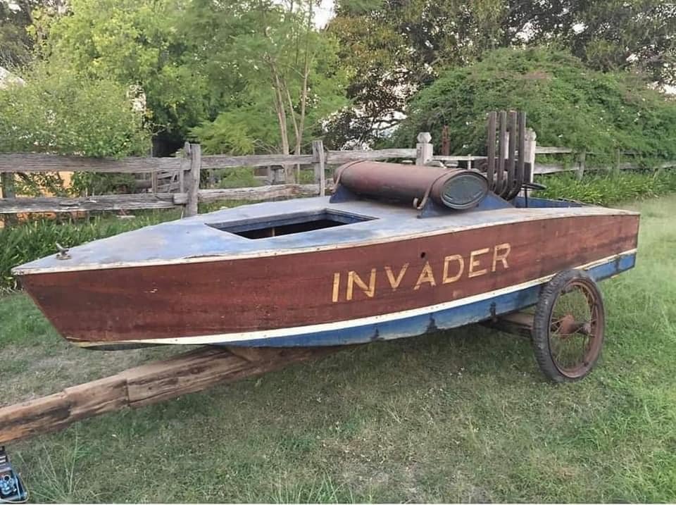 The wooden trailer and wire wheels are almost as great as the boat. 'Invader' that is just awesome.