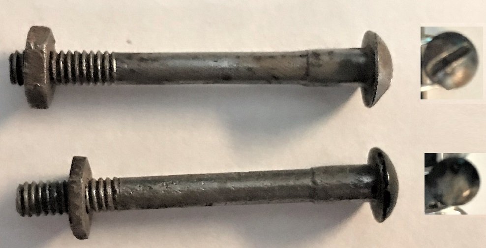 Larry, are either of these correct? Similar style screws but one is slotted and the other is slightly smaller head diameter and no slot. Also different thickness hex nuts. Both were in dirty horn buttons ThanksOriginal Smith wrote: ↑Tue Apr 05, 2022 11:01 amThe photo above is not correct! The part in question is a screw, and is smaller than what is pictured. I detest people posting information like this! The originals were 6-32 X 1 1/2", raven finished. The nut is hex. I have several of these. I pick them up when at Hershey and other places.