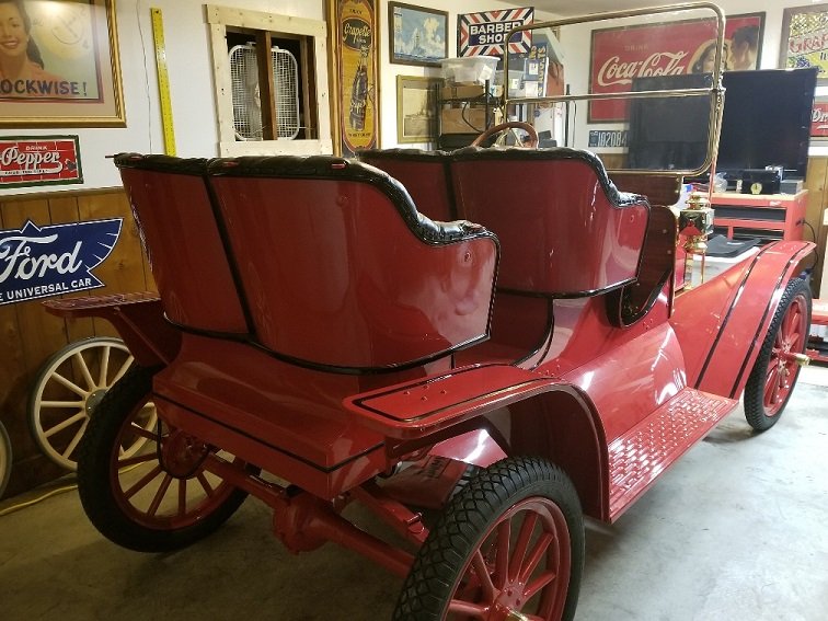 Hello everyone. I wanted to post a photo of my "1910" tourabout build. Yes, it is a bitsa car with a Ray Wells body I purchased about a year ago from Ned Protexter in Iowa, but it is finally starting to look like a car. The paint scheme on original tourabouts was the dark green, but I went with the 1909 touring red/black color scheme. She is not a car for the purist, but I sure bet that she will be some fun to drive and show.