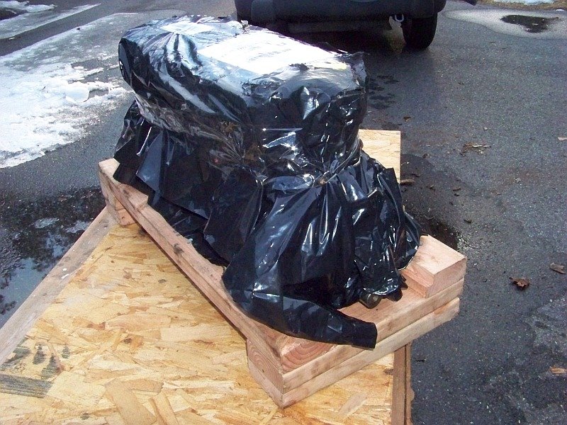The block was secured to a modest "pallet" of boards with another board taped to the top of the block. It was all wrapped in clear plastic with an outer layer of black plastic.